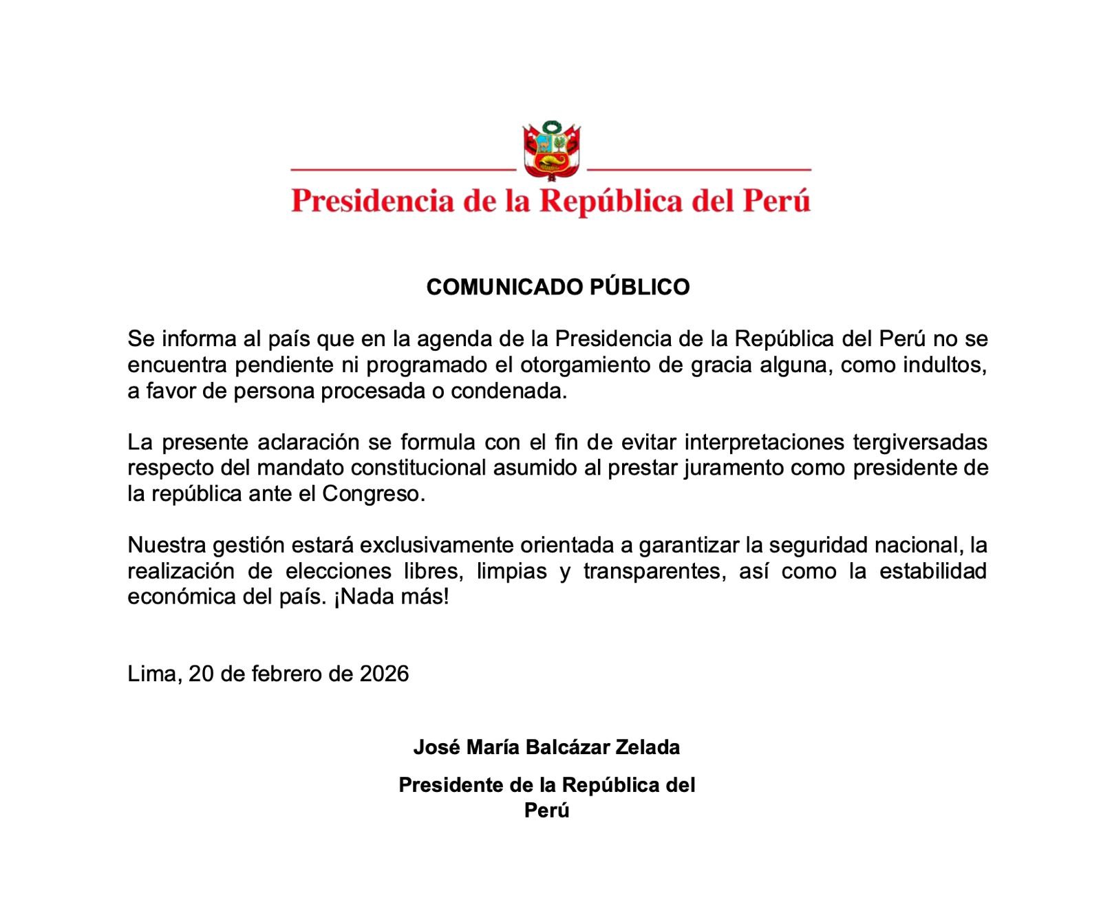 El comunicado fue emitido desde Lima este 20 de febrero de 2026, en medio del debate político generado en torno a un posible indulto al líder de Perú Libre, Vladimir Cerrón.