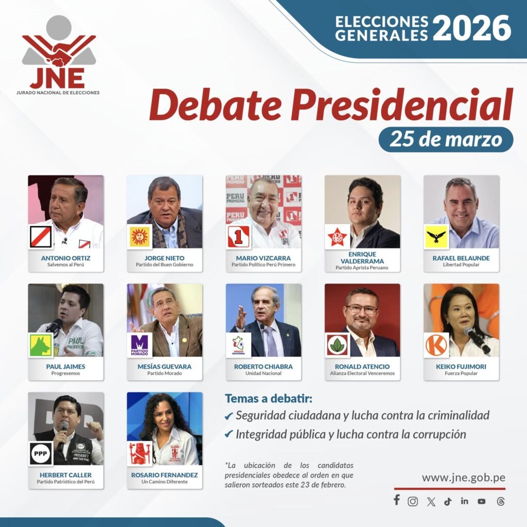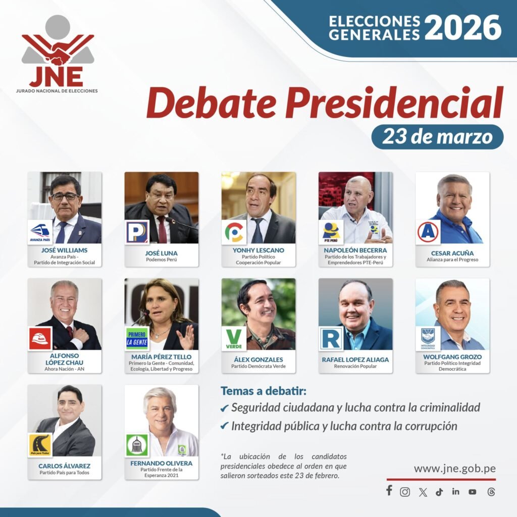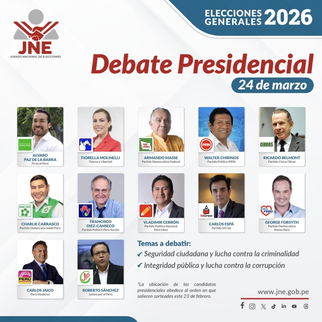 El Jurado Nacional de Elecciones anuncio las fechas de los debates presidenciales para estas Elecciones Generales 2026, los días son el 23, 24 y 25 de marzo.