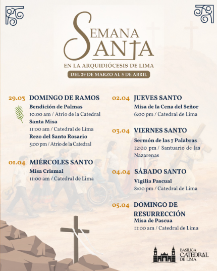 El Viernes Santo, 3 de abril, se conmemora la pasión de Cristo. Por la mañana, a las 10:00 a.m., se llevará a cabo el Vía Crucis en el Penal Sarita Colonia, una representación del camino de Jesús hacia la cruz. Por la tarde, a las 5:00 p.m., se realizará la solemne Liturgia de la Pasión del Señor en la Iglesia Matriz – Catedral del Callao, donde se reflexiona sobre el sacrificio de Cristo y se adora la cruz.