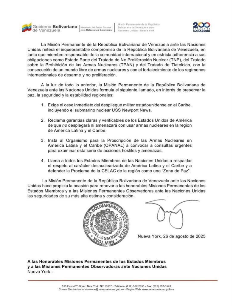 “Solicitamos el apoyo del secretario general de la ONU, António Guterres, para restablecer la sensatez”, dijo Gil, y agregó que, para Venezuela, el despliegue de unidades militares de Estados Unidos en aguas del Caribe genera “preocupaciones” porque representa un atentado “contra la paz”.