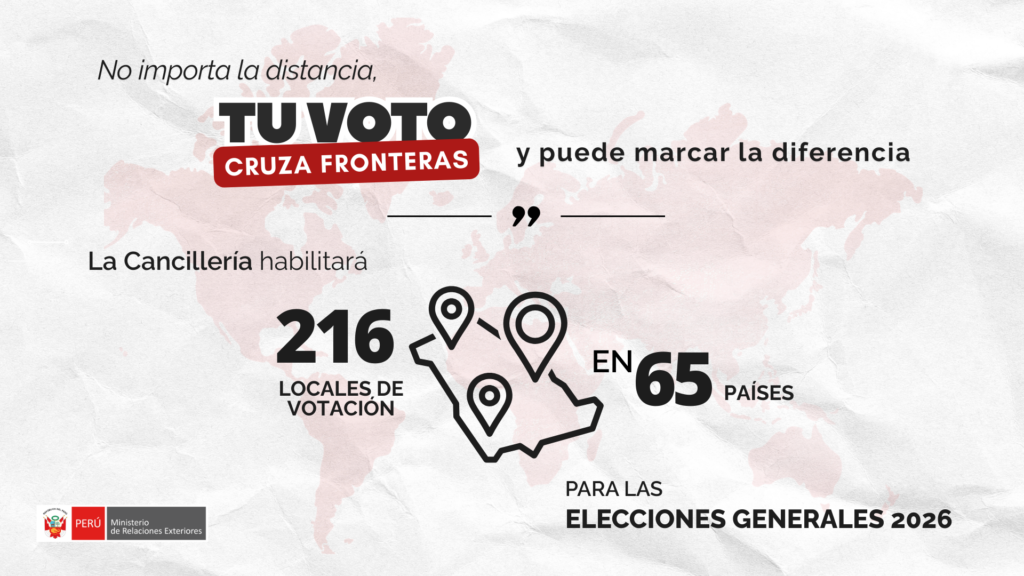 Con el objetivo de garantizar el derecho al sufragio de más de 1.2 millones de peruanos en el exterior, el Ministerio de Relaciones Exteriores habilitará 2509 mesas de sufragio en 216 locales de votación para las Elecciones Generales 2026, los cuales estarán repartidos en 65 países. El despliegue será especialmente grande en Estados Unidos, con veintitrés centros de votación disponibles, y Argentina, con diecisiete.