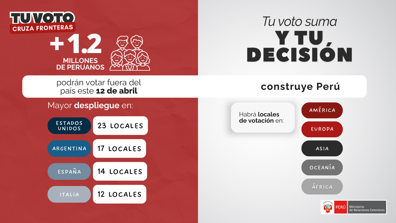 Desde hoy 20 de febrero, los peruanos residentes en el extranjero podrán conocer su local de votación e informarse de todo el proceso electoral en el exterior a través del portal www.gob.pe/tuvotocruzafronteras.