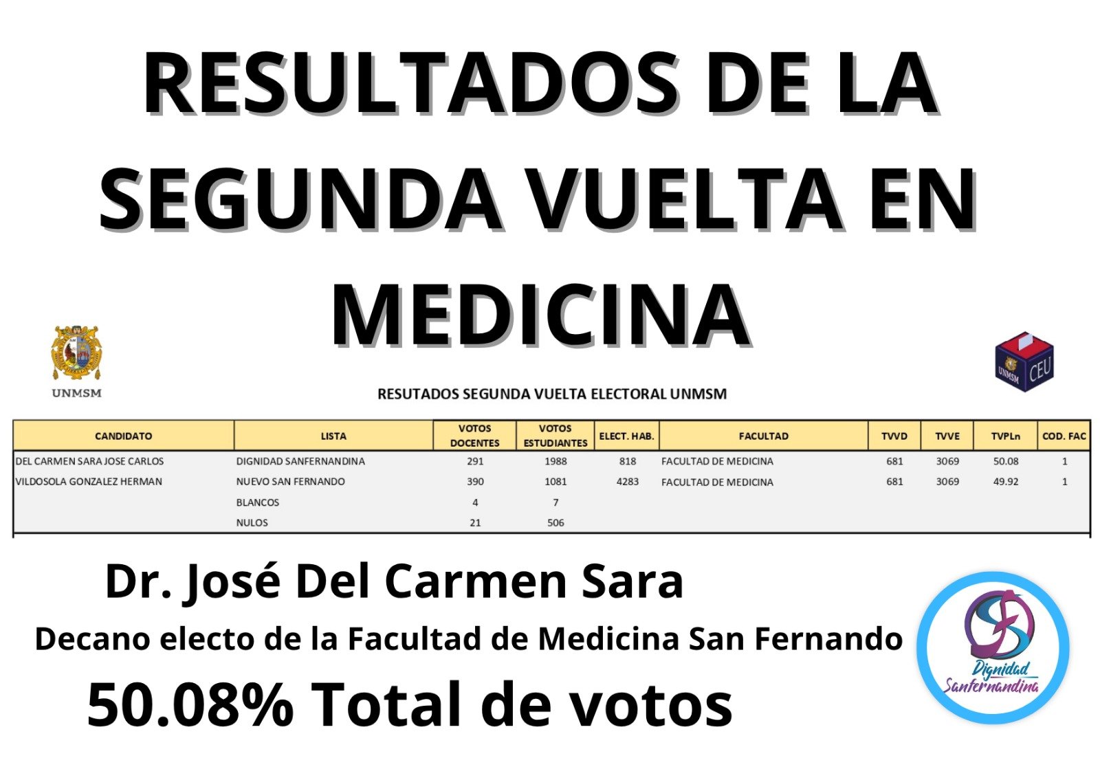 Concluida la segunda vuelta electoral para la elección de 9 decanos en la Universidad Nacional Mayor de San Marcos –entre ellas, la de la Facultad de Medicina San Fernando– realizada el pasado 11 de junio, los resultados dieron como ganador absoluto al Dr. José Del Carmen Sara al haber obtenido el 50.08% del total de votos, convirtiéndose legalmente en el decano electo para el periodo 2025-2029, tal como lo establece el Reglamento de Elecciones de la UNMSM 2025.